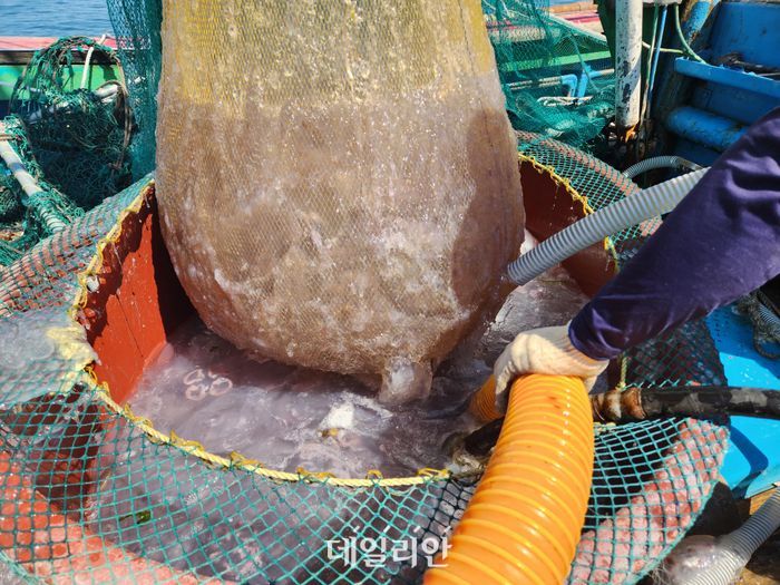 보름달물해파리 제거 작업 현장.ⓒ해양수산부
