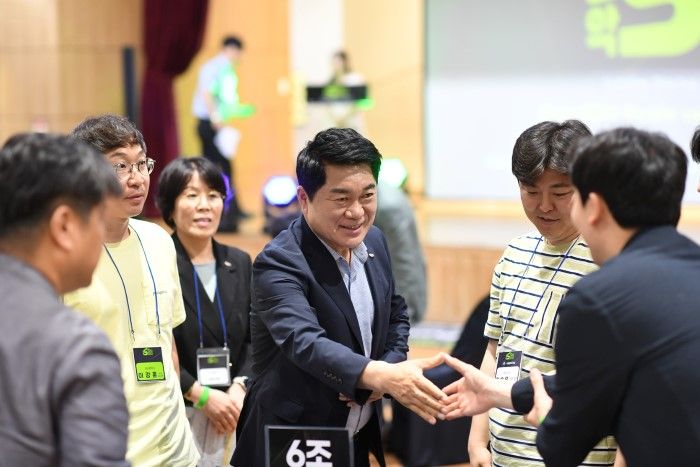 박준희 관악구청장이 네트워킹데이에서 참가기업 대표와 인사를 나누고 있다ⓒ관악구 제공