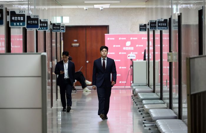 김용태 국민의힘 비상대책위원장이 지난 13일 국회에서 수원지법 대북송금재판 관련 현안 입장발표를 하기 위해 회의실로 향하고 있다. ⓒ뉴시스