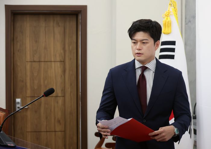 김용태 국민의힘 비상대책위원장이 지난 13일 국회에서 수원지법 대북송금재판 관련 현안 입장발표를 하기 위해 발언대로 향하고 있다. ⓒ뉴시스