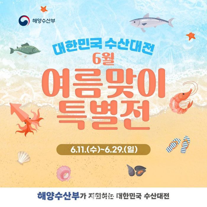 해양수산부는 소비자 장바구니 물가 부담을 완화하고 수산물 소비를 촉진하기 위해 대한민국 수산대전-여름맞이 특별전을 개최한다고 12일 밝혔다.