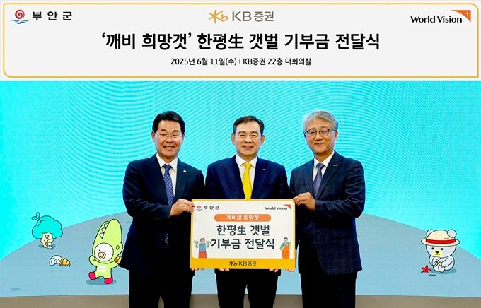 13일 KB증권에 따르면 지난 11일 서울 여의도 KB증권 본사에서는 ‘깨비의 희망갯, 한평生 갯벌’ 기부금 전달식이 진행됐다. 이 자리에는 김성현 KB증권 대표이사와 권익현 전라북도 부안군수, 나윤철 월드비전 나눔사업부문장 등 주요 관계자들이 참석했다.