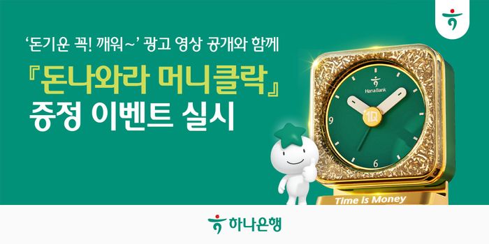 하나은행은 12일 대표 모바일앱 '하나원큐'에서 새로운 광고 영상 '돈기운 꼭!깨워'를 공개하고, 폐지폐를 활용해 제작한 알람시계 '돈나와라 머니클락' 신규 굿즈를 증정하는 이벤트를 실시한다고 밝혔다.