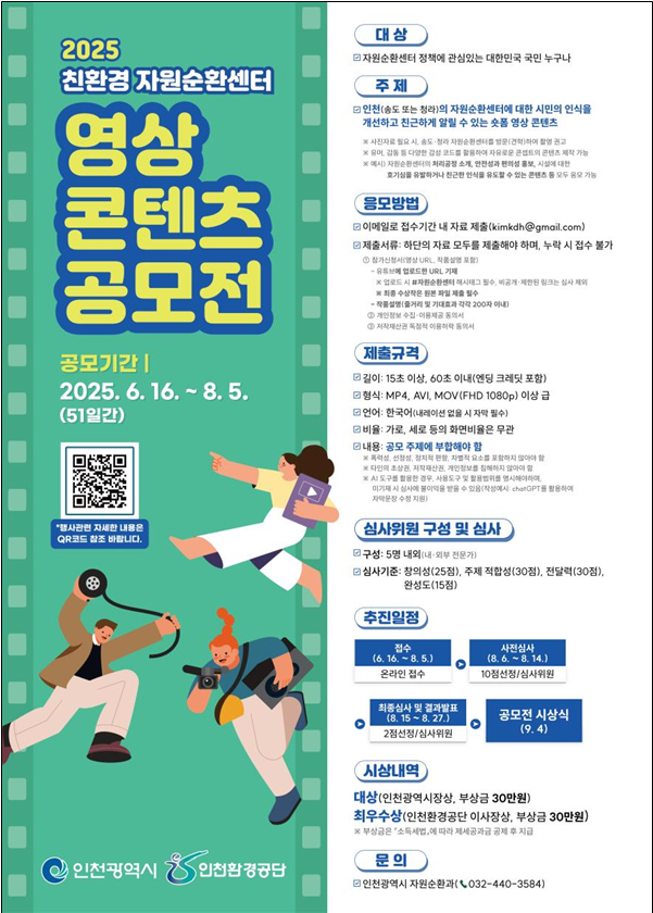 ‘친환경 자원순환센터 영상콘텐츠 공모전’은 인천 자원순환센터에 대한 시민 인식을 개선하고 친근하게 알릴 수 있는 자유주제로 15초 이상 60초 이내의 숏폼 영상이다.