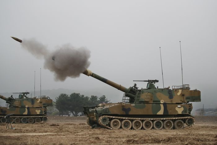 지난해 4월 강원도 철원군 문혜리사격장에서 수도포병여단, 17사단, 해병2사단이 합동 포탄사격 훈련을 실시하고 있다. 사진은 K55A1자주포가 사격하는 모습. ⓒ사진공동취재단