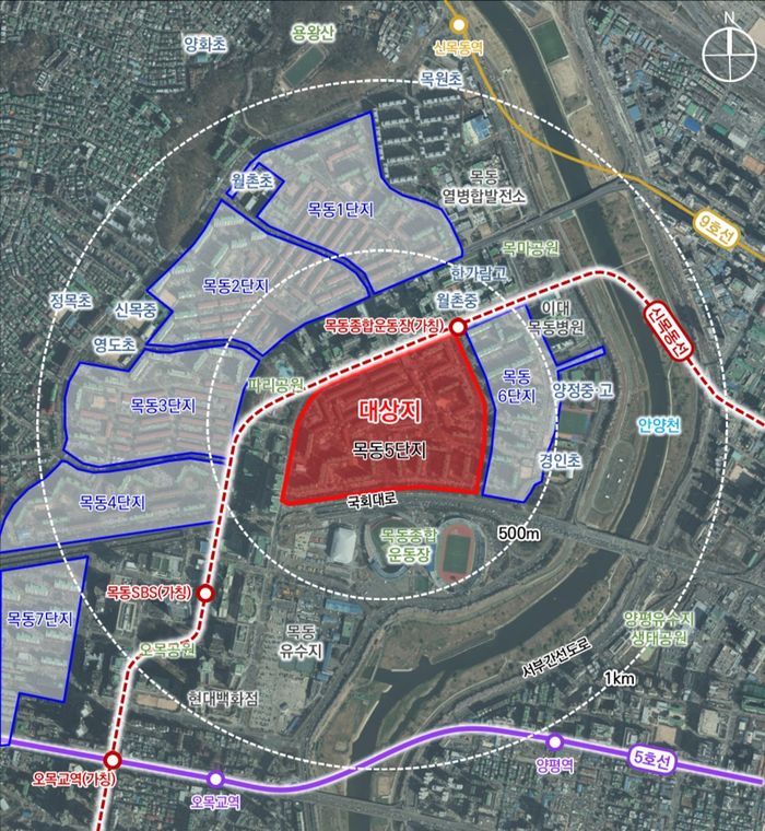 목동 5단지와 7단지, 9단지가 각각 최고 49층 높이의 대규모 아파트 단지로 탈바꿈할 전망이다.목동5단지 위치도.ⓒ서울시