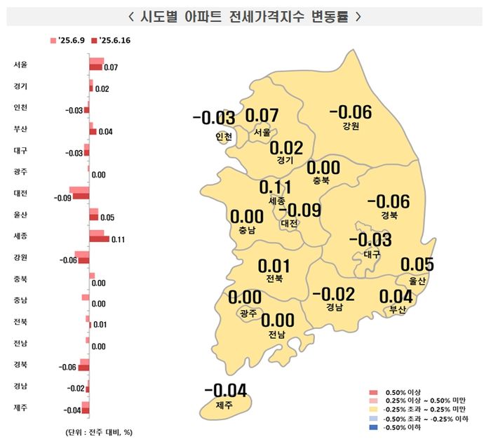 5대 광역시는 -0.04%, 8개도는 -0.02% 하락률을 나타냈고, 세종은 일주일 전(0.18%) 대비 상승폭이 줄어든 0.10%로 조사됐다.