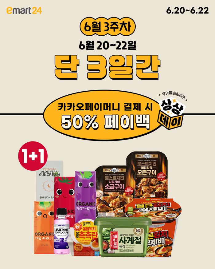 6월 3주차 상상데이는 ‘롯데 유기농 유제품 3종’과 ‘이가 얼큰김치수제비 197g’을 포함한 간편식품 4종 등 총 11종의 상품을 대상으로 1+1 행사를 진행한다.