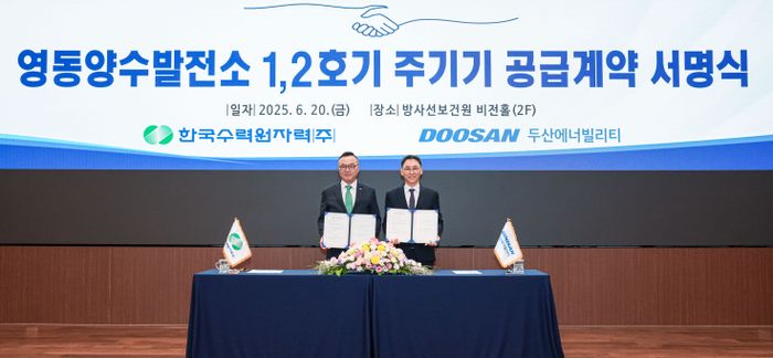 이날 서울 중구 한수원 방사선보건원에서 열린 체결식에는 한수원 황주호 사장, 두산에너빌리티 정연인 부회장 등 양사 주요 관계자들이 참석했다.