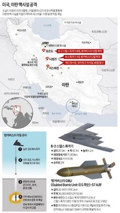 미국 정부는 21일(현지시간) 전격 단행된 이란 핵시설 3곳에 대한 공습과 관련해 미군 B-2 폭격기 7대가 벙커버스터 GBU-57 14발을 투하했으며, 이란은 이에 제대로 대응하지 못했다고 밝혔다.