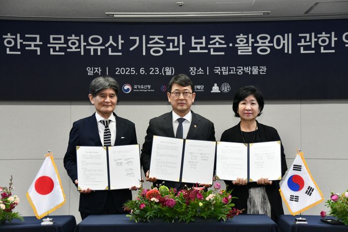 (왼쪽부터) 사토 다카오 고덕원 주지, 최응천 국가유산청장김정희 국외소재문화유산재단 이사장이 23일 '관월당' 부재를 한국으로 정식 양도하는 기증협약서에 서명한 뒤 기념 촬영하는 모습. ⓒ국가유산청.