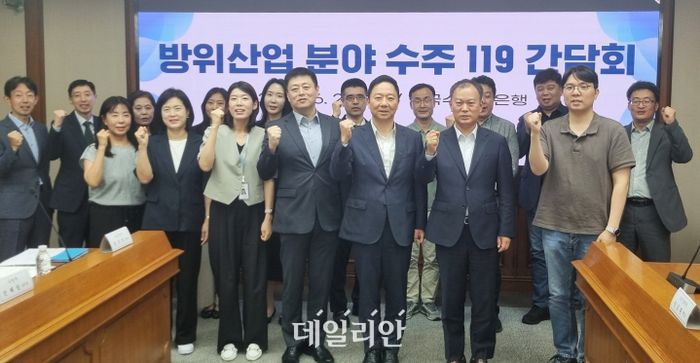 김동준 기획재정부 원스톱수출수주지원단 부단장이 24일 서울 영등포구 한국수출입은행에서 열린 방위산업 분야 수주 119 간담회에서 참석자들과 기념촬영을 하고 있다.ⓒ기획재정부