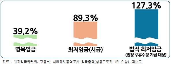 임금 인상 추이와 관련해 경총은 “2014년부터 2024년까지 10년간 명목임금이 39.2% 오르는 동안, 최저임금은 89.3% 인상됐고 주휴수당을 포함할 경우 실질 인상률은 127.3%에 달한다”고 설명했다.