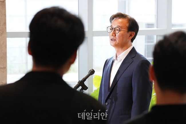 전재수 해양수산부 장관 후보자가 인사청문회 준비단 사무실 출근길 기자들과 만나 질의응답을 하고 있다. ⓒ공동취재단