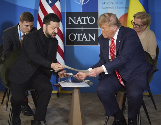 AP통신에 따르면 젤렌스키 대통령은 25일(현지시간) 나토(NATO·북대서양조약기구) 정상회의가 열린 네덜란드 헤이그에서 50분 동안 트럼프 대통령과 회담했다고 밝혔다. 두 사람이 만난 건 지난 4월 26일 열린 프란치스코 교황의 장례미사 뒤 처음이다.