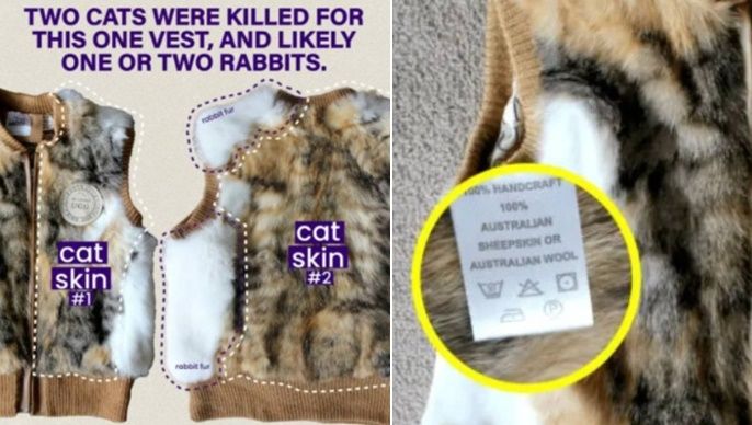 해당 조끼 라벨에는 ‘100% 호주산 양가죽 또는 울’이라고 표기돼 있다. 하지만 분석 결과 조끼 앞뒤에는 고양이 두 마리 분량의 가죽이 사용됐고, 나머지 부위에는 토끼털이 포함된 것으로 드러났다.