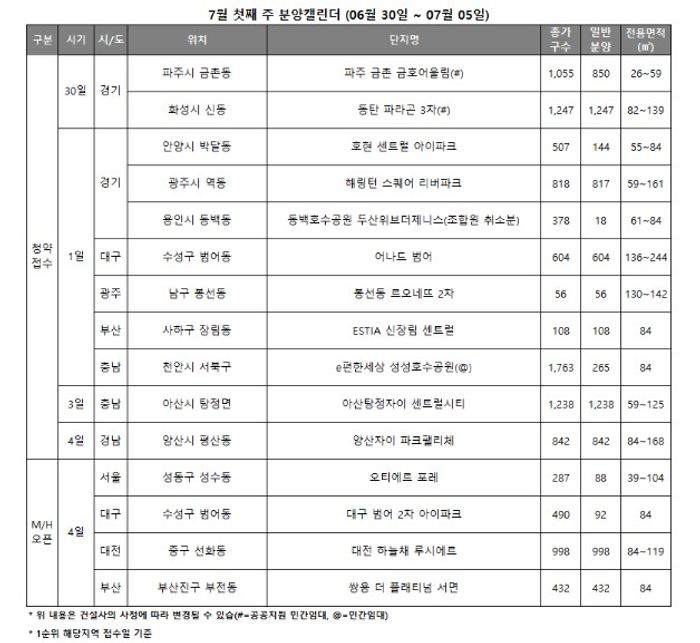 27일 리얼투데이에 따르면 7월 첫째 주에는 전국 11곳에서 총 6189가구(공공지원 민간임대·민간임대 포함, 행복주택 제외)가 청약 접수를 받는다.