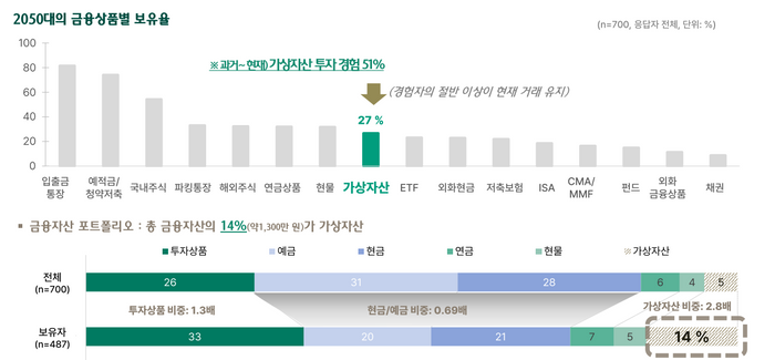 하나은행 하나금융연구소가 가상자산 투자자의 특징 변화와 향후 투자 의향을 분석한 '2050세대 가상자산 투자 트렌드' 보고서에 따르면 2050세대 설문 참여자의 27%는 현재 가상자산을 보유 중이라고 응답했다.ⓒ하나은행 하나금융연구소