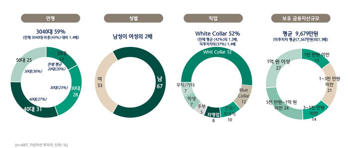 이들의 현금성 자산은 전체의 0.7배에 불과하지만 투자액(가상자산 포함)은 1.5배가 더 많고, 그 중 가상자산 투자액은 1000만원이 넘어 총 금융자산의 14%를 차지했다.