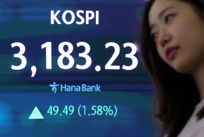 코스피가 전 거래일(3133.74)보다 49.49포인트(1.58%) 오른 3183.23에 마감한 10일 오후 서울 중구 하나은행 딜링룸 전광판에 지수가 표시되고 있다. ⓒ뉴시스