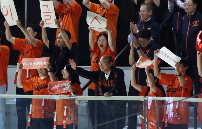 김승연 한화그룹 회장을 비롯한 임직원이 3일 대전 한화생명볼파크에서 열린 2025 신한 SOL 뱅크 KBO리그 NC 다이노스와 한화 이글스의 경기를 관람하고 있다. ⓒ연합뉴스