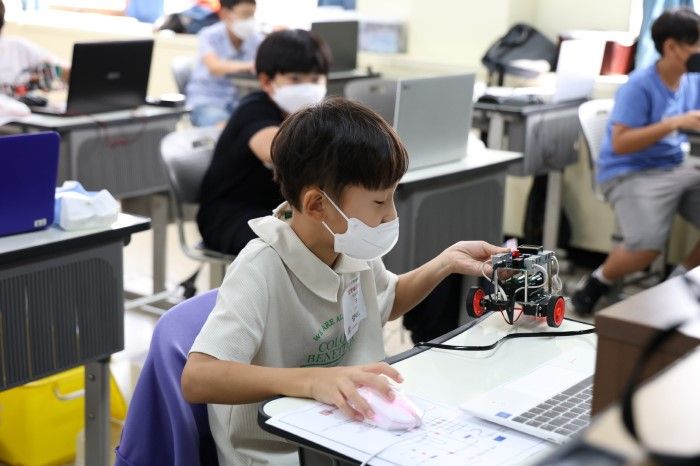 지난해 열린 제19회 전국학생로봇경진대회에서 로봇알고리즘 종목에 참여한 학생이 코딩과제를 수행하고 있다.ⓒ구로구 제공