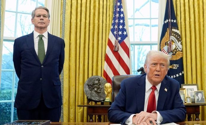 스콧 베센트(왼쪽) 미국 재무장관이 지난 2월3일 워싱턴 백악관 집무실에서 행정명령 서명을 준비하는 도널드 트럼프 대통령의 연설을 경청하고 있다. ⓒ AP/뉴시스