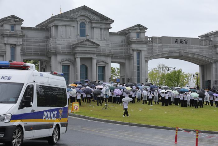 김건희 여사의 각종 의혹들을 수사하는 민중기 특별검사팀이 통일교 시설과 관계자를 대상으로 압수수색에 나선 지난 18일 오전 경기도 가평군 통일교 본부에서 신도들이 집회를 열고 있다. ⓒ연합뉴스