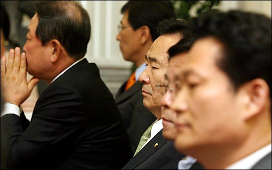 노무현 전 대통령이 박연차 회장으로부터 ´저희 집´에서 돈을 받았다고 고백한 가운데 8일 오전 국회에서 열린 민주당 최고위원회의에서 정세균 대표와 최고위원들이 심각한 표정을 하고 있
