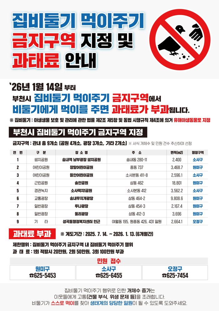 시는 시민들에게 쾌적한 휴식권을 보장하고 공중위생을 확보하기 위해 지난 14일부터 공공장소 9개소를 ‘집비둘기 먹이 주기 금지구역’으로 우선 지정해 고시했다. 금지구역은 송내역 남부광장 쌈지공원, 둘리광장, 성곡동행정복지센터 인근 등 시민들이 자주 찾는 주요 공원과 광장을 포함한 9개소다.