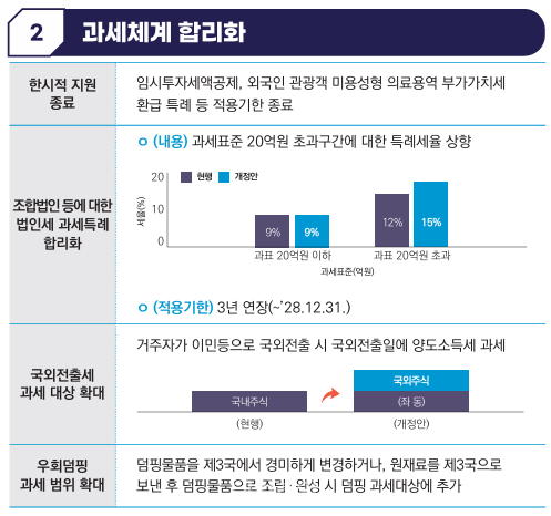 아울러 과세체계 합리화도 추진한다. 조합법인 등에 대한 법인세 과세특례 세율 조정을 통해 과표 20억원 초과분에 대해서 12%보다 3% 높은 15%를 적용하기로 했다. 나머지는 기존과 동일하다. 내년 1월 1일 이후 개시하는 사업연도 분부터 적용된다.