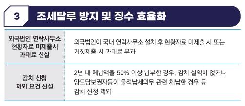 체납 징수의 실효성 제고 방안으로 고액·상습체납자 감치 면제 규정도 새로 만들었다. 최근 2년간 체납액 대비 납부비율이 50% 이상인 경우, 회생 계획에 따라 국세를 납부 중인 경우, 감치 실익이 없는 경우, 수탁자와 양도담보권자가 물적 납세의무 관련 체납한 경우 중 하나면 된다.