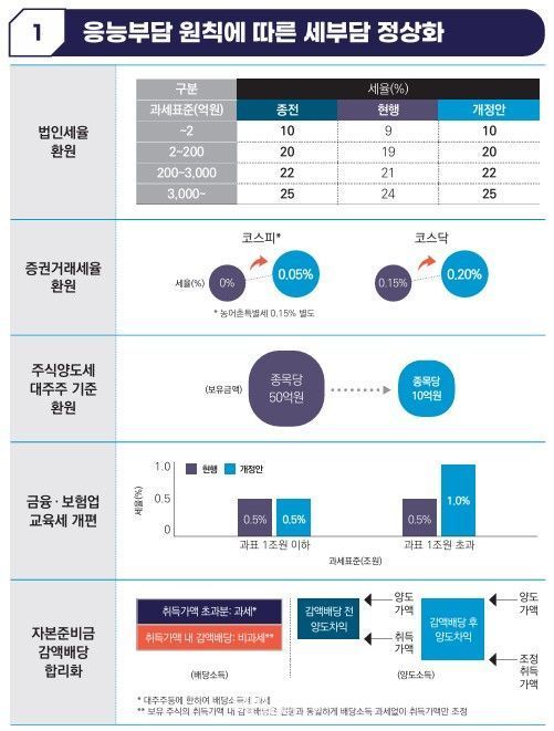 정부가 전 정부에서 24% 내린 법인세 최고세율은 25%로 되돌린다. 주식 양도소득세 관련 대주주 기준도 현행 50억원에서 10억원으로 강화한다. 또한 영리법인에 유증시 상속인과 그 직계비속의 배우자도 상소세 납부 대상에 포함하도록했다.