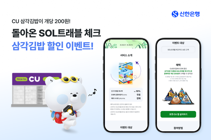 신한은행은 간편식 수요가 늘어나는 여름철을 맞아 8월1일부터 15일까지 CU편의점과 함께 ‘돌아온 SOL트래블 체크 삼각김밥 할인 이벤트’를 진행한다고 1일 전했다.