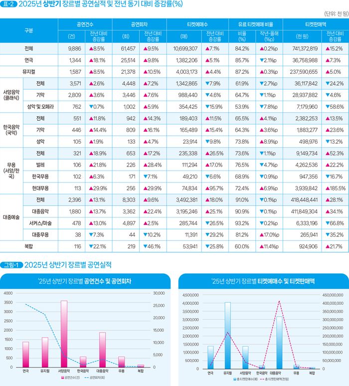 연극과 뮤지컬 시장은 올해 상반기 역대 가장 우수한 성적을 냈으며 무용과 대중음악 역시 큰 폭의 성장을 보였다. 전년 동기 대비 무용의 티켓예매수는 26.5%, 티켓판매액은 52.3% 증가하였다. 대중음악 역시 티켓예매수 기준 25.1%, 티켓판매액 기준 34.1%의 증가율을 나타냈다. 특히 무용 장르 중 현대무용은 티켓예매수가 95.7%, 티켓판매액은 185.5% 증가하며, 전년 동기 대비 높은 증가율을 보였다. 반면, 서양음악(클래식)은 공연건수와 공연회차를 제외한 티켓예매수와 티켓판매액에서 전년 동기 대비 각각 7.9%, 24.2% 감소한 것으로 나타났다.