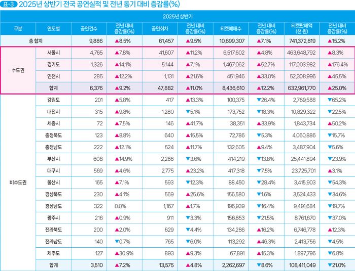 올해 상반기 기준 서울·경기·인천 수도권이 차지하는 비율은 공연건수의 64.5%, 공연회차의 77.9%였으며, 티켓예매수와 티켓판매액 역시 각각 78.9%, 85.4%로 공연의 공급(공연건수, 공연회차)과 수요(티켓예매수, 티켓판매액)가 대부분 수도권에서 발생한 것으로 나타났다. 특히, 수도권의 전 실적은 전년 동기 대비 증가하였으나, 비수도권은 티켓예매수와 티켓판매액이 감소하며 수요 쏠림 현상이 전년 동기 대비 심화된 것으로 분석된다.