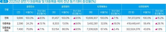 KOPIS 기준, 올해 상반기 공연시장은 1,070만 매의 티켓예매와 7,414억 원의 티켓판매액을 기록하며 역대 상반기 기준 최고치를 경신했다. 이는 2021년부터 꾸준히 성장한 수치로 전년 동기 대비 각각 70만 매(+7.1%), 977억 원(+15.2%)이 증가한 수치다. 1매당 평균 티켓판매가는 약 6만 9천 원으로 지난해보다 약 5천 원 상승했다.