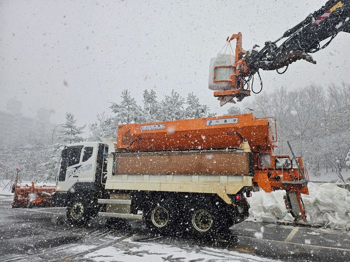 도로 제설을 위해 제설차량에 제설제를 싣고 있는 모습. ⓒ용인시 제공