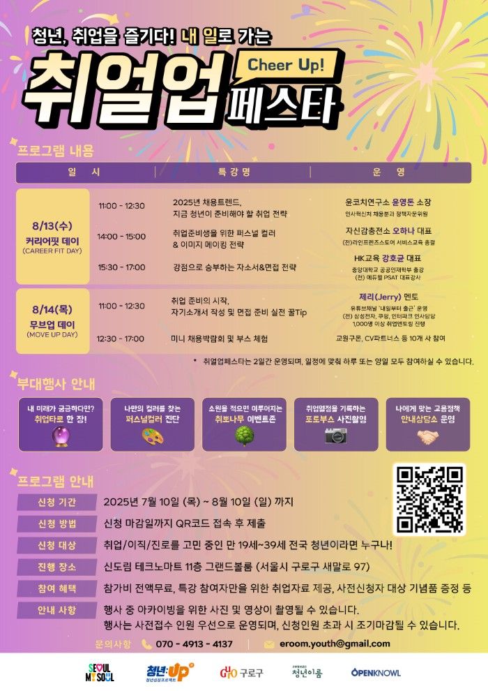서울 구로구(구청장 장인홍)가 오는 13일부터 14일까지 신도림테크노마트에서 청년들의 취업 역량 강화를 위한 대규모 취업 특강 및 채용박람회인 '2025 구로 청년이룸 취얼업(Cheer-Up!) 페스타'를 개최한다고 5일 밝혔다.
