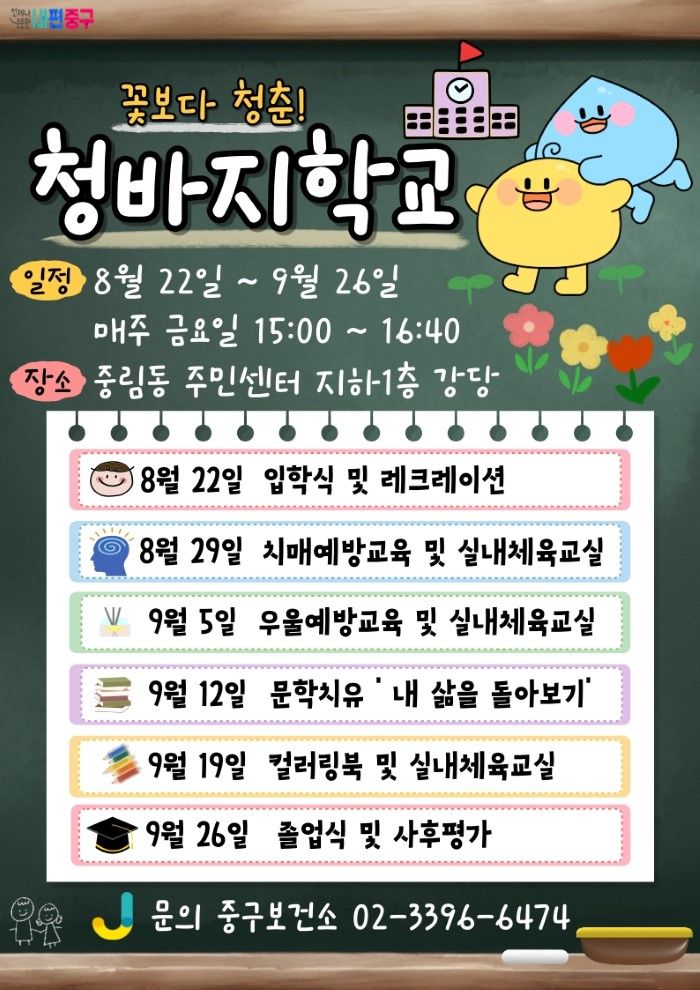 동국대학교, 중구치매안심센터, 중구체력인증센터가 함께 하는 '청바지학교'는 자아존중감 향상 레크리에이션을 시작으로, 치매 예방 인지활동, 우울 예방 교육, 근력 강화 운동, 문학치유 프로그램, 컬러링북 활동 등 다채로운 강의가 마련되어 있다. 특히 각 회차마다 신체활동과 정서 지원이 균형 있게 구성되어 있다.