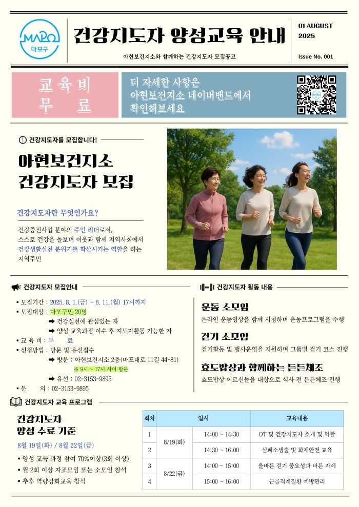 '2025년 건강지도자 양성교육'참여를 희망하는 구민은 8월11일까지 아현보건지소를 방문하거나 전화(☎02-3153-9895)로 신청하면 된다.