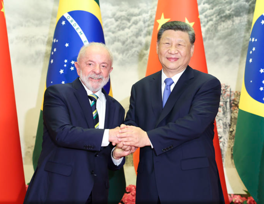 시진핑(오른쪽) 중국 국가주석이 지난 5월 13일 루이스 이나시우 룰라 다시우바 브라질 대통령과 베이징에서 만나 악수하고 있다. ⓒ신화/뉴시스