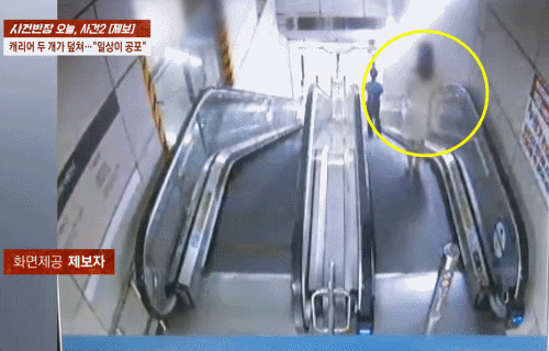 당시 20kg에 달하는 캐리어를 가지고 에스컬레이터에 탄 한 남성이 손잡이를 놓는 순간 캐리어가 중심을 잃고 아래로 굴러가기 시작했고, 앞서 내려가던 여성을 그대로 덮쳤다.