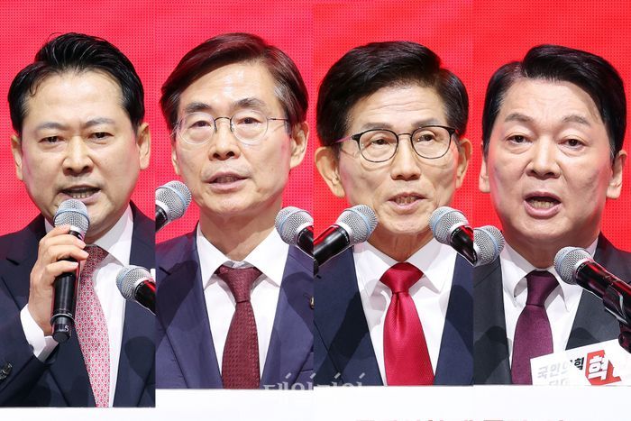 10일 정치권에 따르면 국민의힘 8·22 전당대회 본경선에 진출한 당대표 후보 4인은 '전한길의 난' 대처 방안을 놓고 2대2로 갈려 있는 상황이다. 조경태 후보와 안철수 후보는 전 씨의 출당과 제명을 촉구하고 있는 반면, 김문수 후보와 장동혁 후보는 전 씨에게만 책임을 묻는 것은 '악마화'라고 주장하고 있다.