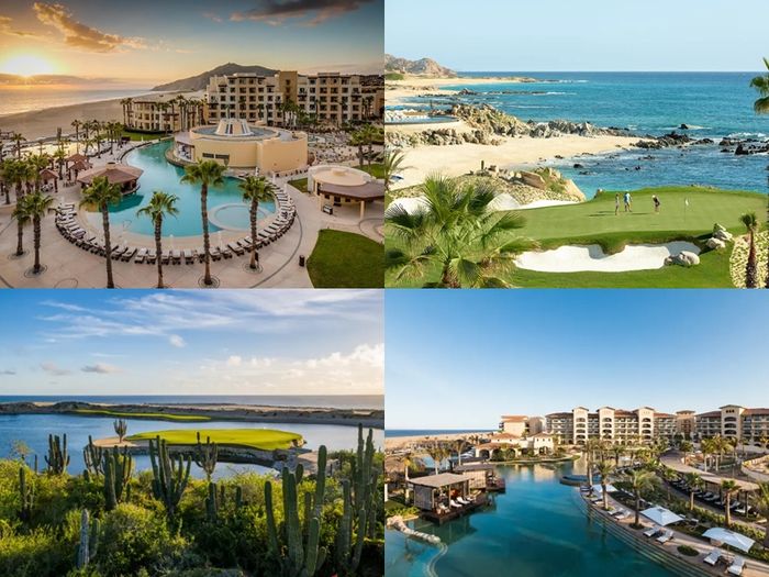 멕시코 로스카보스 올인클루시브&세계100대 코스 골프투어 호텔 및 주요 코스(왼쪽 위부터 시계방향으로 푸에블로 보니토 퍼시피카 리조트&스파,카보 델 솔 골프 코스,그랜드 솔마르 퍼시픽 듄스 골프 리조트,솔마르 골프 링크스. ⓒ AGL