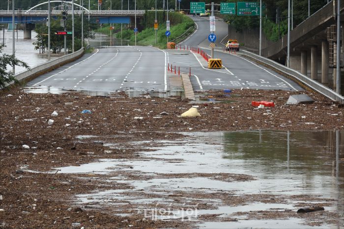 수도권을 중심으로 매우 많은 비가 내려 서울 전역에 '호우특보'가 발령된 13일 서울 노원구 월릉교에서 중랑천에 '홍수주의보'가 내리며 동부간선도로가 통제되고 있다.