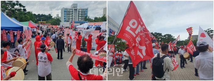 최고 온도가 31도를 찍었던 13일 오후 1시의 대전광역시. 국민의힘 8·22 전당대회 '충청·호남 합동연설회'가 열리는 서구에 위치한 배재대학교 스포렉스홀 정문 앞 마당에는 더운 날씨도, 주변의 모든 소리도 집어삼킬 듯한 굉음이 울려퍼지고 있었다.