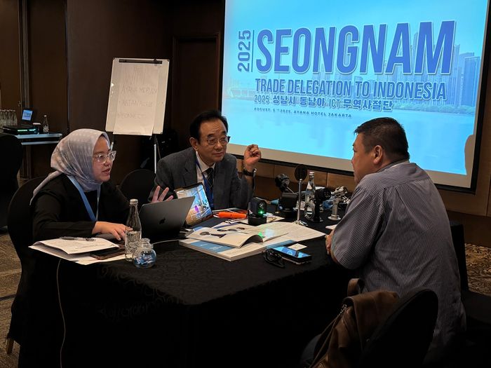 지난 5일 인도네시아 수출상담회에서 한 성남기업이 해외바이어와 미팅을 하고 있는 모습. ⓒ성남시 제공
