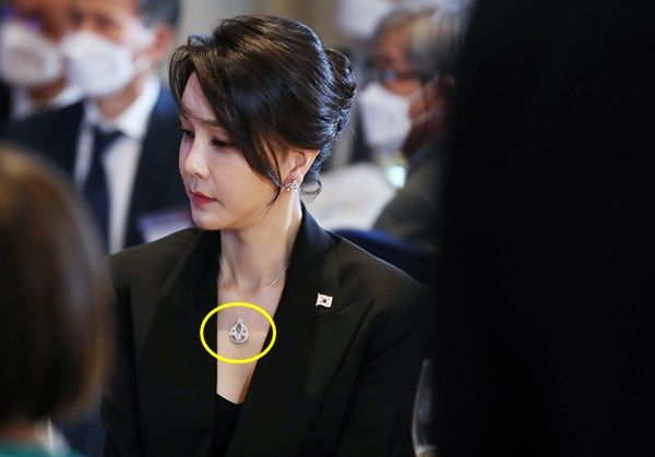 해당 목걸이는 2022년 6월 윤석열 전 대통령의 첫 해외 순방지였던 스페인 마드리드 나토 정상회의에서 1500만원 상당의 까르띠에 팔지, 2000만원대 티파니 브로치와 함께 착용하며 논란이 됐다.