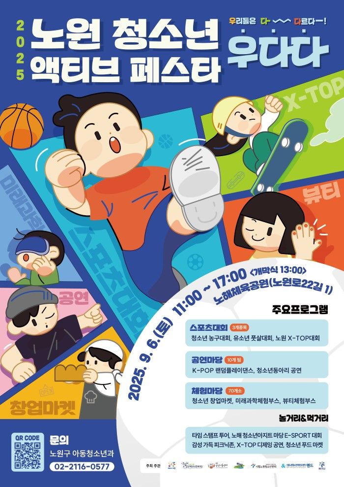 서울 노원구(구청장 오승록)가 오는 6일 노해체육공원(노원로22길1)에서 지역 청소년들을 위한 스포츠·문화 축제 <2025노원 청소년 액티브 페스타 '우다다'>를 개최한다고 18일 밝혔다.
